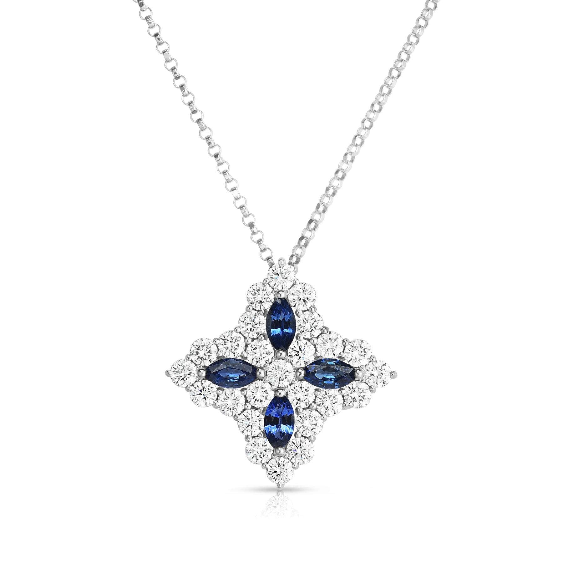 18 karat white gold Roberto Coin Princess Large Necklacee containing 0.65 carat total of four blue sapphires surrounded by 1.23 carat total of diamonds.