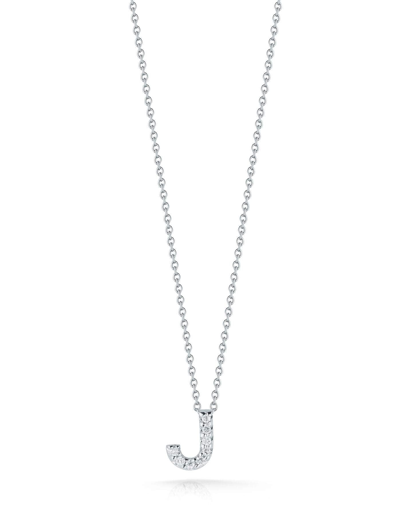 18 karat white gold Roberto Coin Tiny Treasure Love Letter "J" Pendant Necklace containing 0.04 carat total of diamonds.