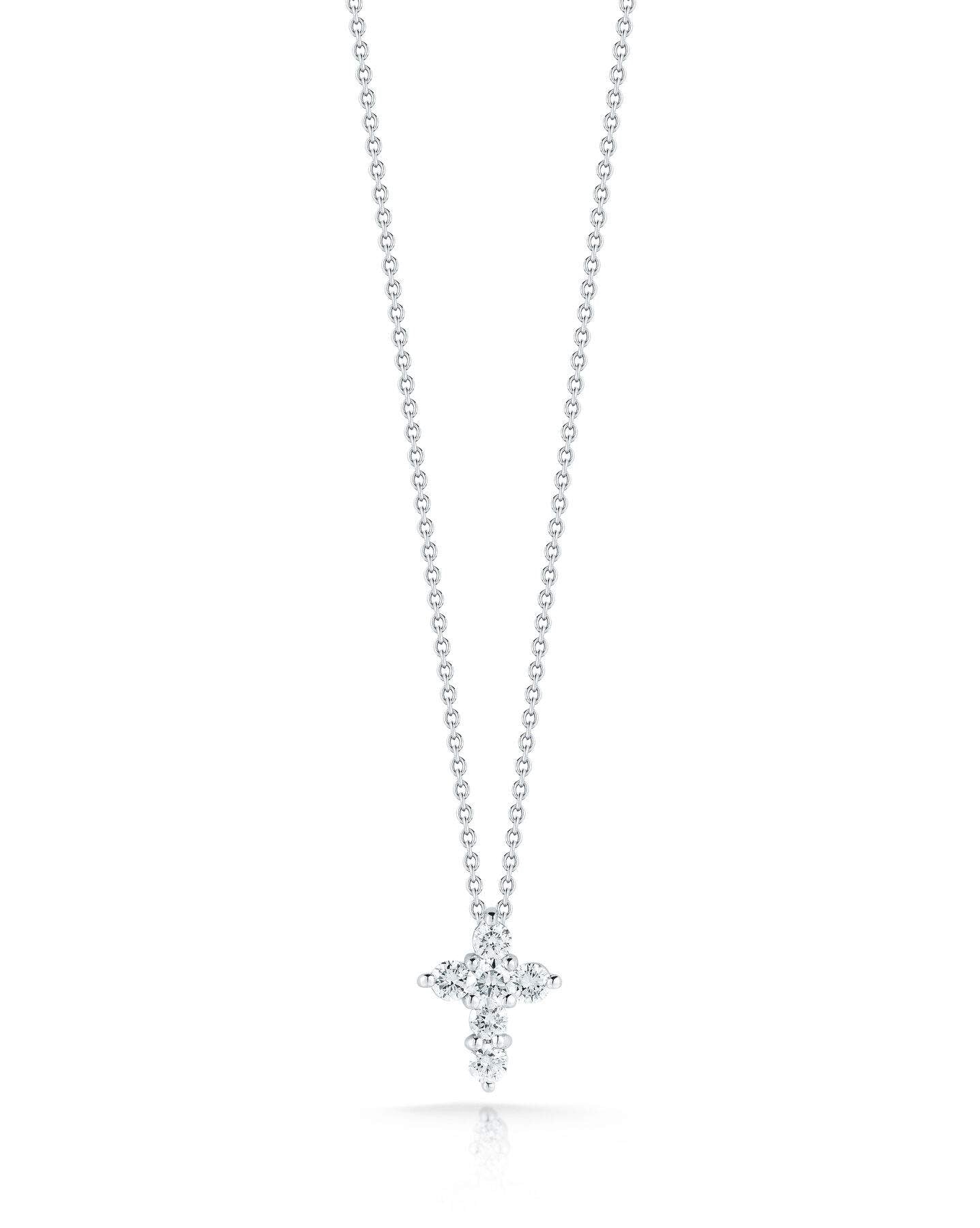 18 karat white gold Roberto Coin Tiny Treasure Mini Cross Pendant Necklace containing 0.20 carat total of diamonds.