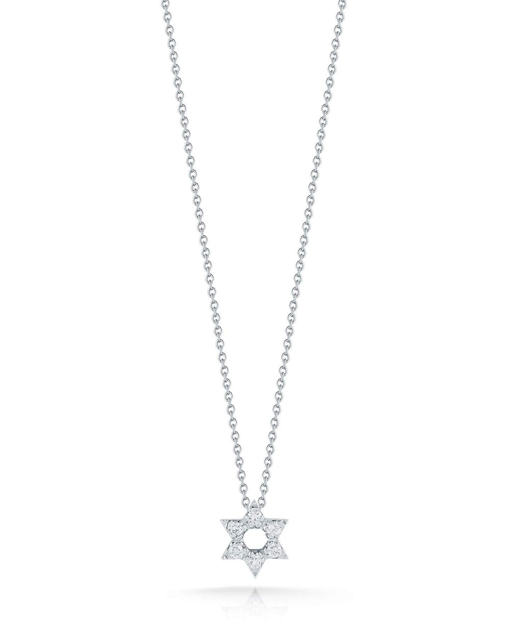 18 karat white gold Roberto Coin Tiny Treasures Star Of David Pendant Necklace containing 0.09 carat total of diamonds.