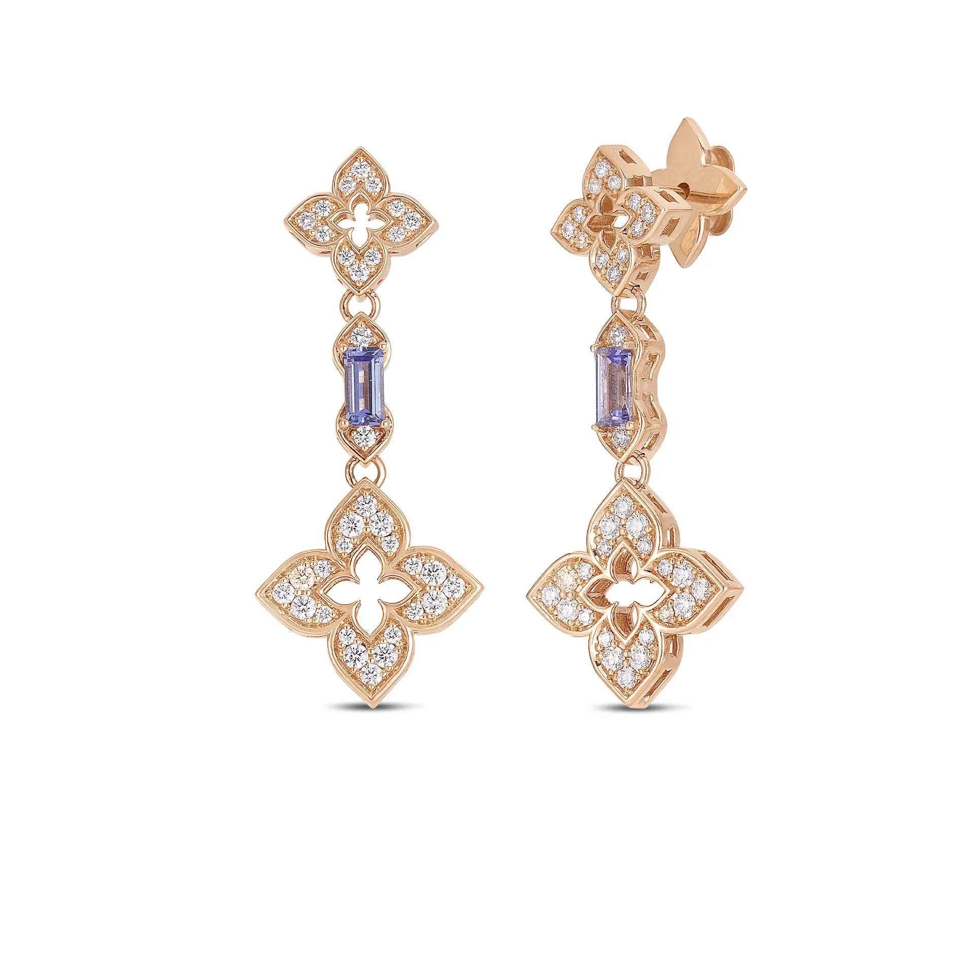 18 karat yellow gold Roberto Coin Venetian Princess Carnival Flower Dangle Earrings containing 0.45 carat total of two tanzanite surrounded by 0.59 carat totla of diamonds.