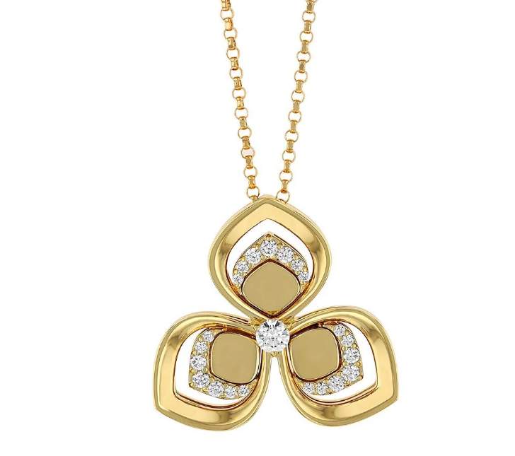 Roberto Coin 18K Yellow Gold 3 Petal Diamond Pendant on 17" Chain, Diamonds=~0.18ctw. A symbol Of Perfection,The Number 3 Gives Shape To Each Of The Pieces In The Petals Collection By Roberto Coin. Essential and modern, the design is also delicate, just like the nature it represents.