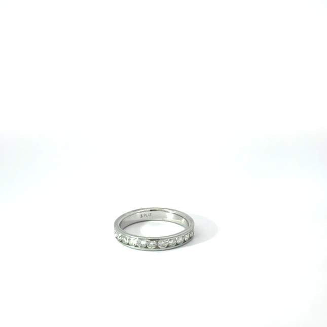 Crafted in platinum, this band features 0.38 carats of channel set round brilliant diamonds. Ring is sized to a 5 3/4.