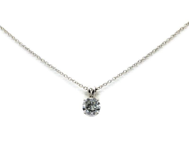 Pendant features a 2.08CT round brillian diamond, H-I color, I2 clarity, set in platinum on an 18" chain.