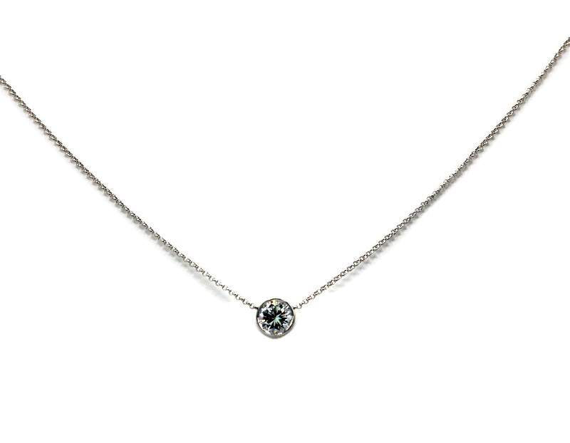Pendant features one .57CT round brilliant diamond, I-J color, VS2 clarity, bezel set in 18K white gold on an 18" chain.
