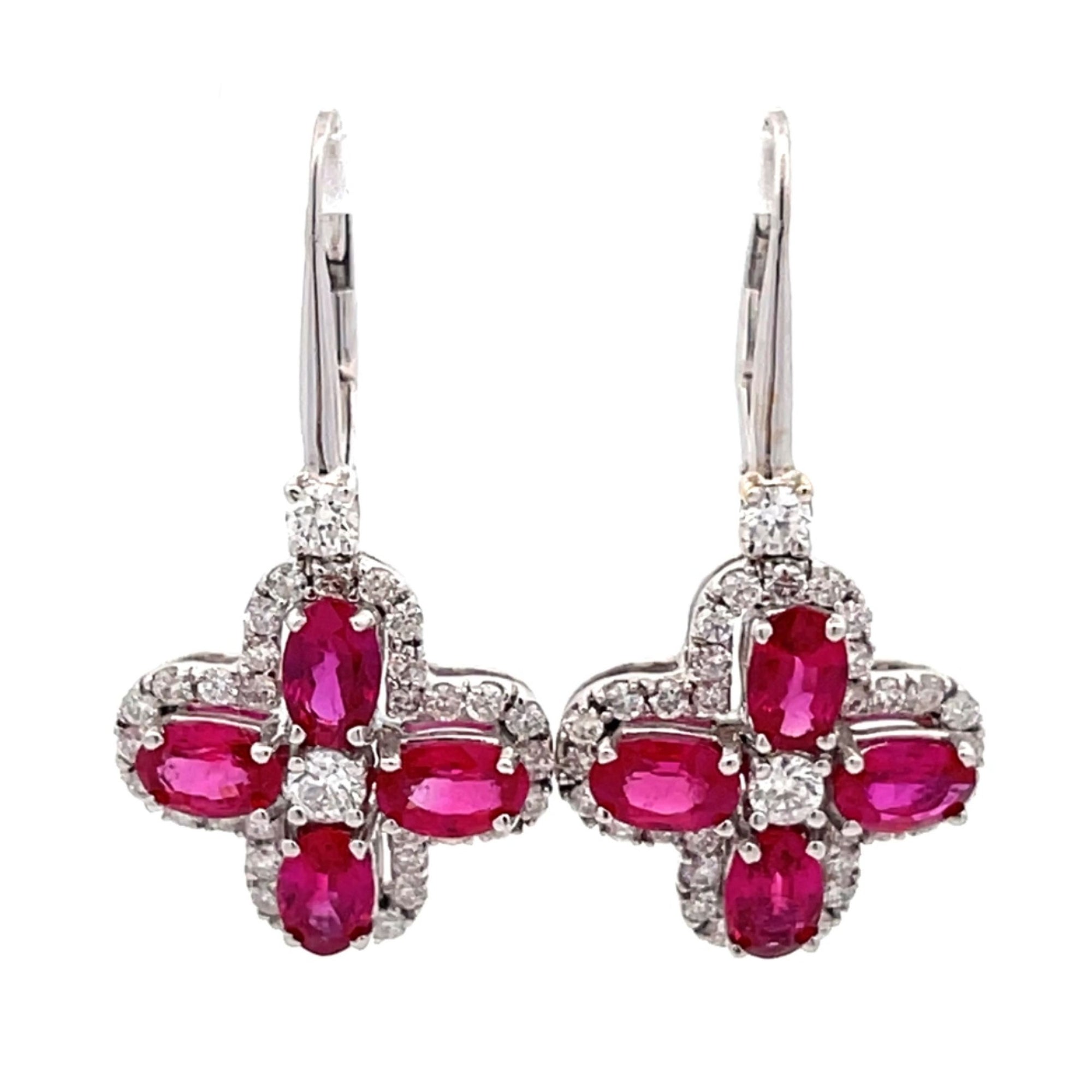 18 karat white gold dangling earrings containing 3.95 carat total of rubies surrounded by 1.29 carat total of diamonds.