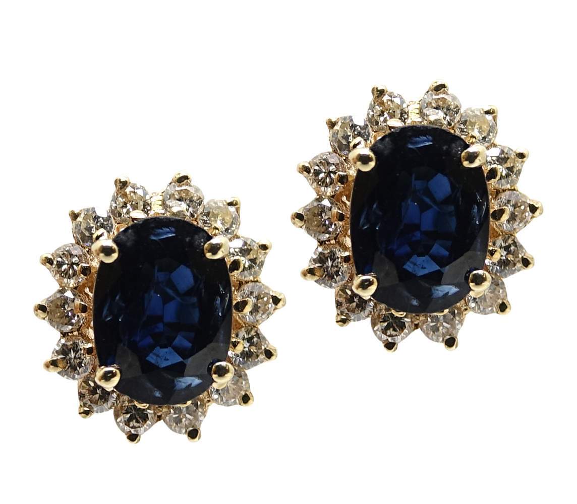 14 karat yellow gold flower stud earrings containing 2.70 carat total of two oval blue sapphires surrounded by 0.84 carat total of round brilliant round diamonds with I-J in color and VS-SI in clarity.