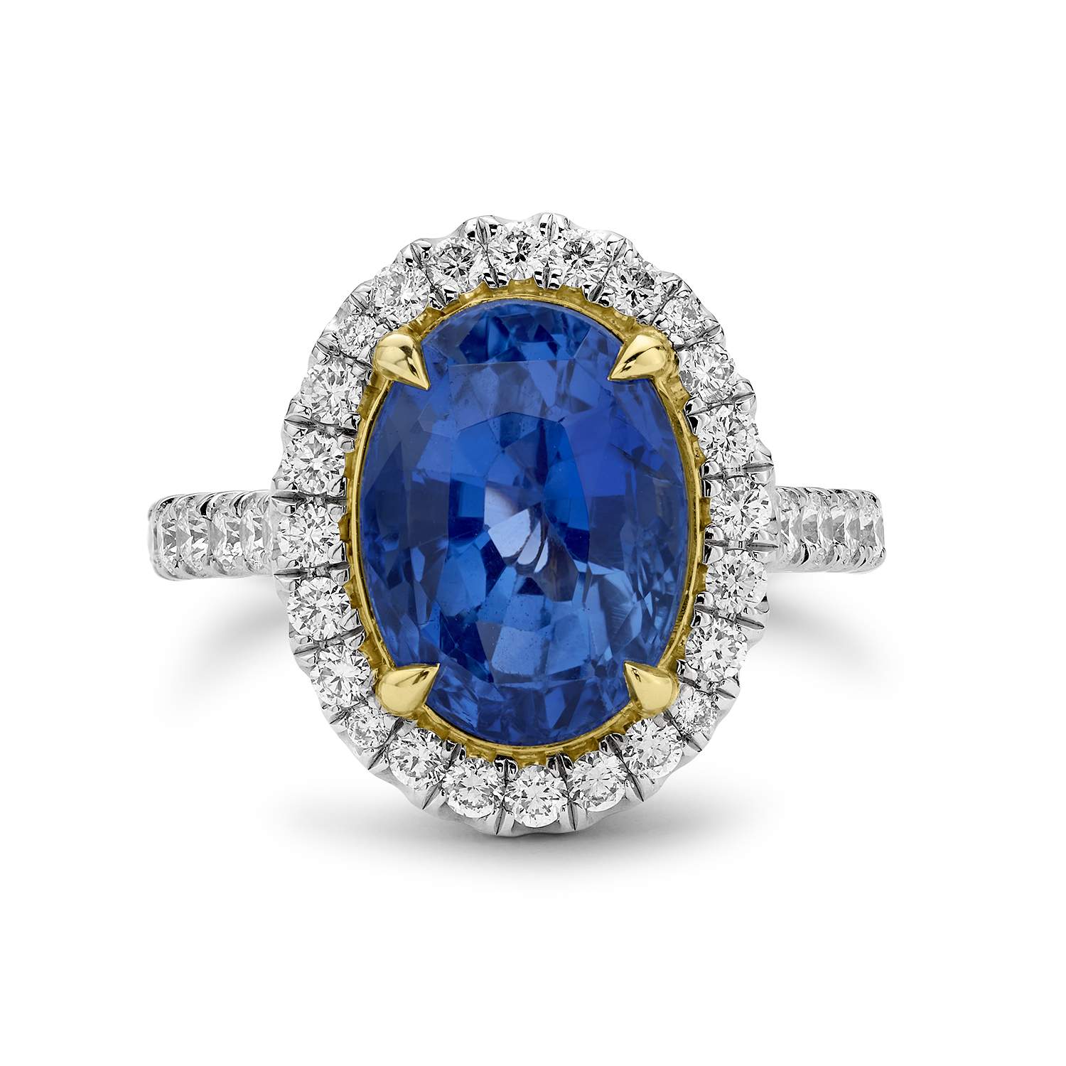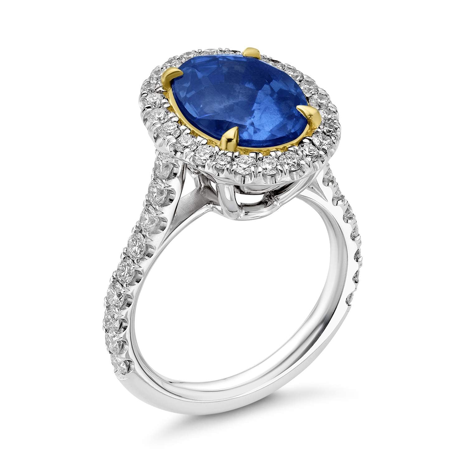 Ring features a 6.96 carat oval blue sapphire surrounded by 1.08 carats of diamonds set in 18 karat white and yellow gold.