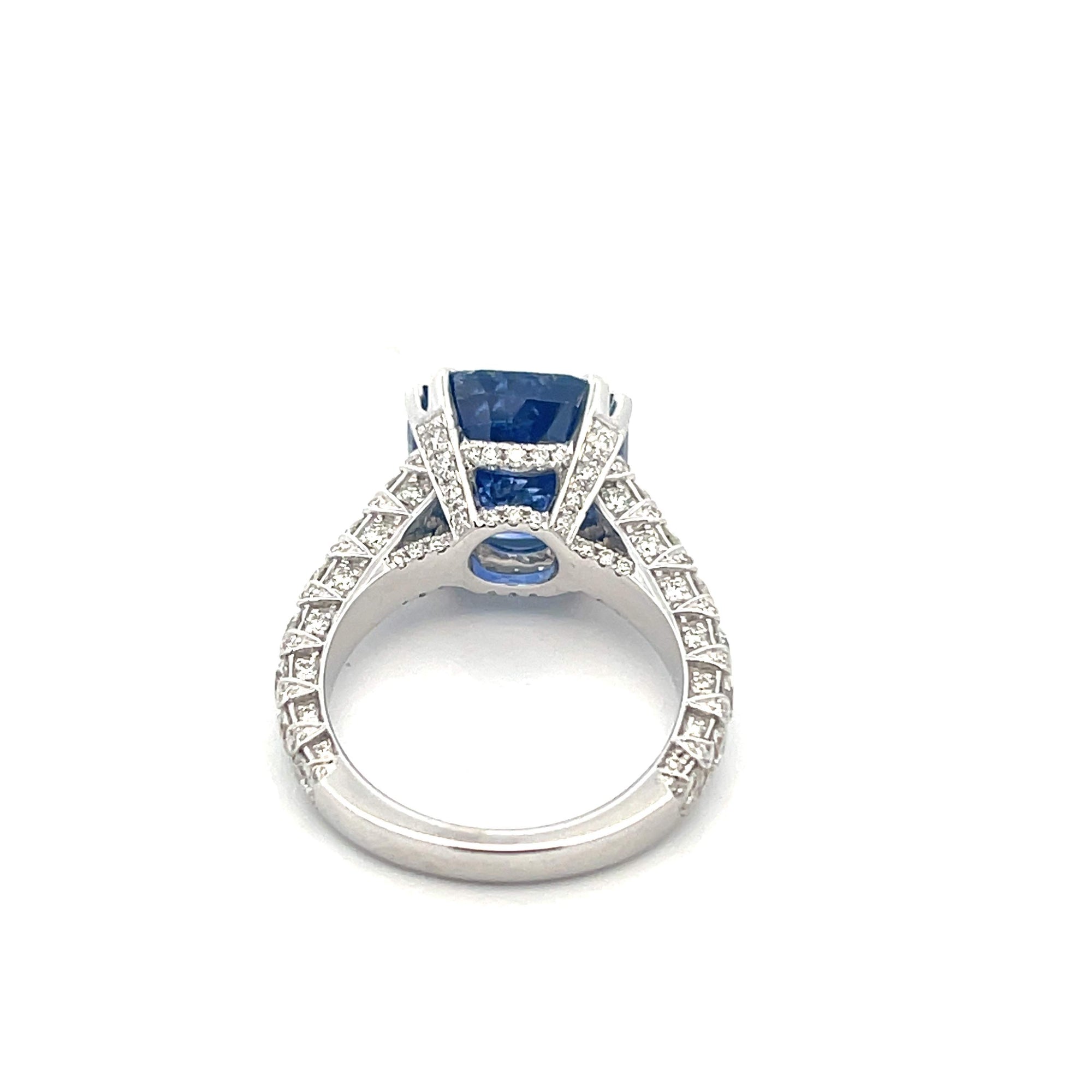 18 karat white gold ring containing 7.64 carats of a center, GIA certified, octagonal natural, sri lanka, and no heat blue sapphire surrounded by 2.10 carat total of round diamonds and 7.14 carat total of small round diamonds.