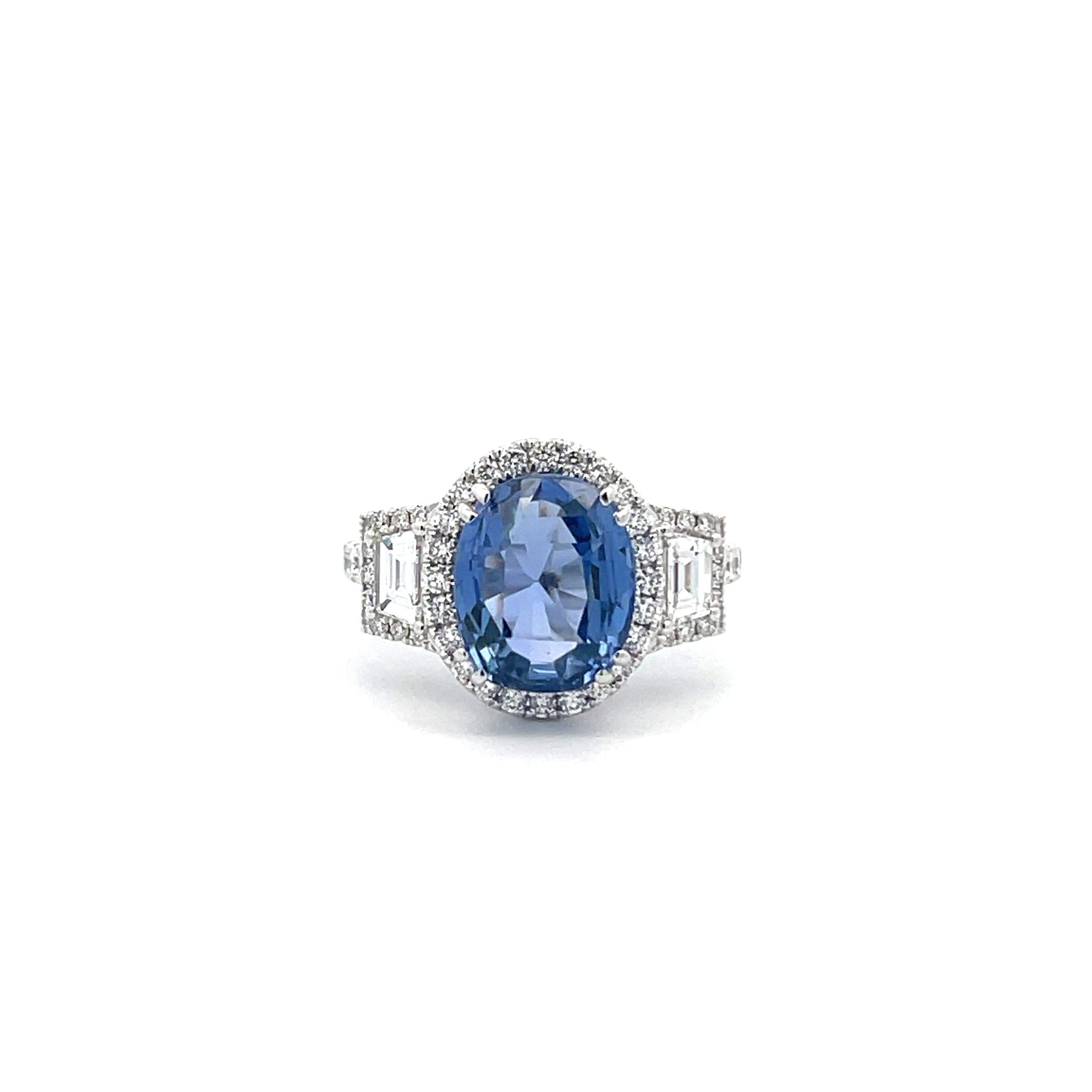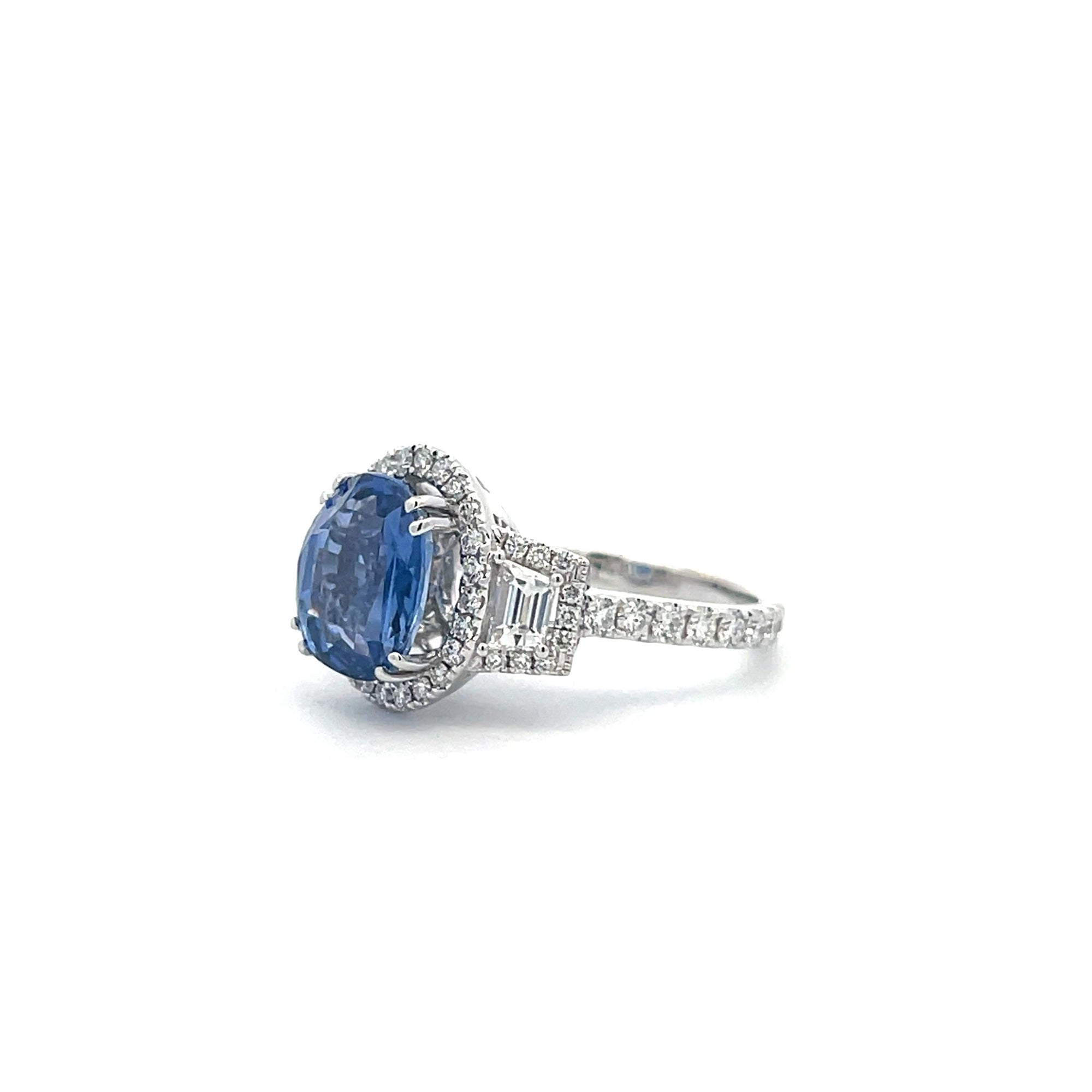 18 karat white gold ring containing 4.10 carats of a, GIA certified, natural, sri lanka, and no heat blue sapphire surrounded by 0.50 carat total of two trapeze diamonds and 0.76 carat total of round diamonds.