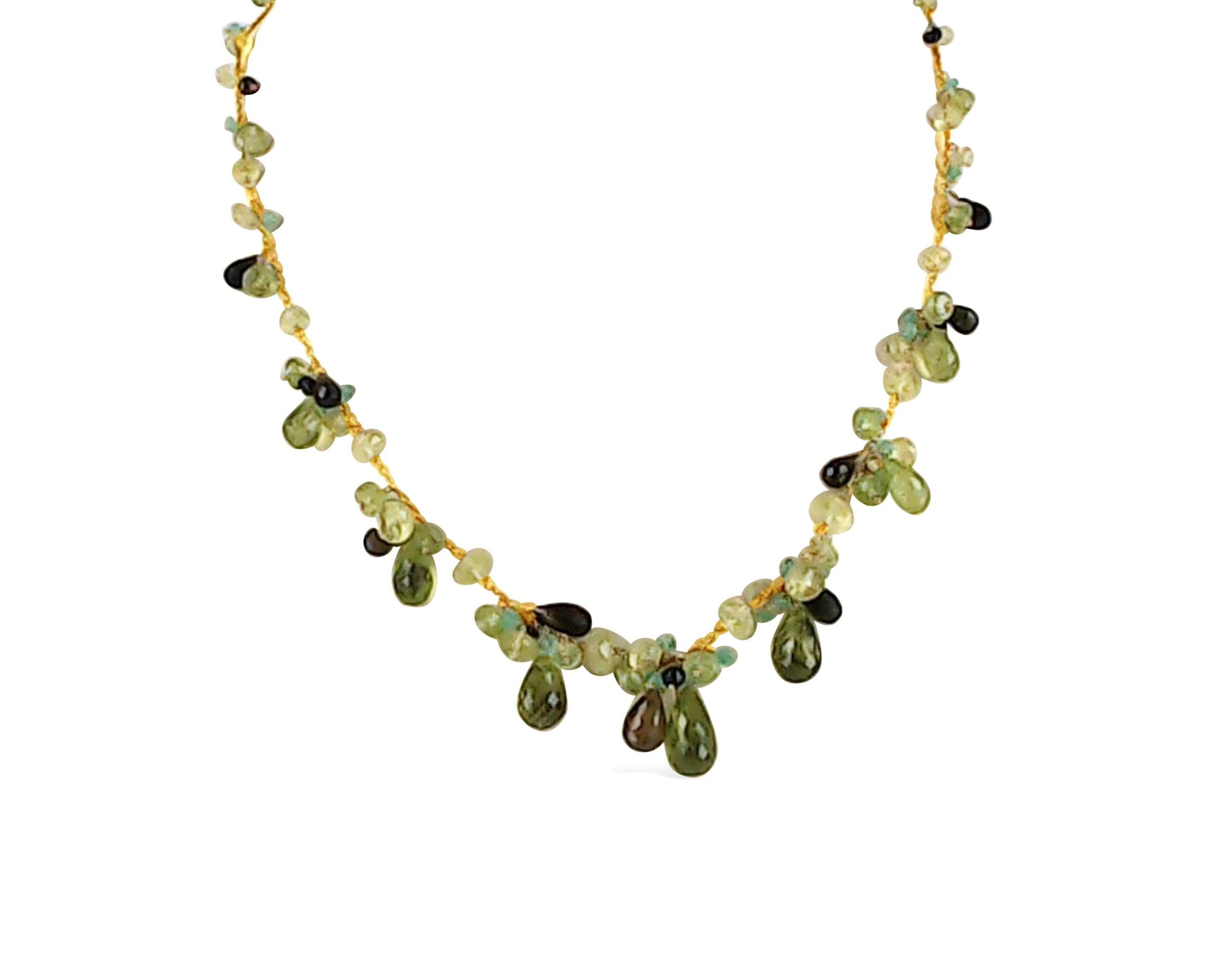 This unique necklace features an assortment of green semi precious Briolette stones, set in 18K yellow gold.