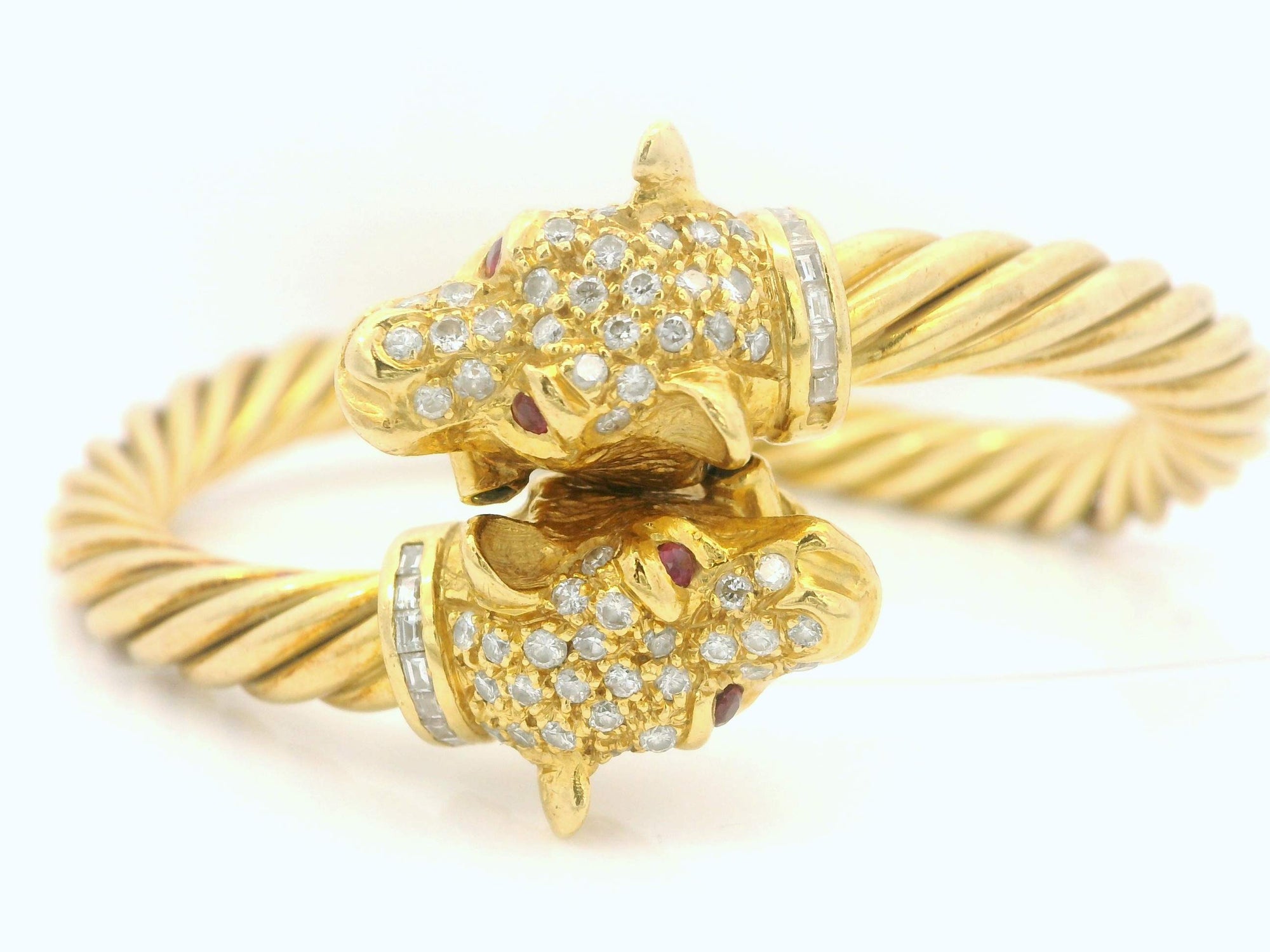 Graceful 18k yellow gold cable cuff bracelet featuring two pave diamond tiger heads with ruby and sapphire accents