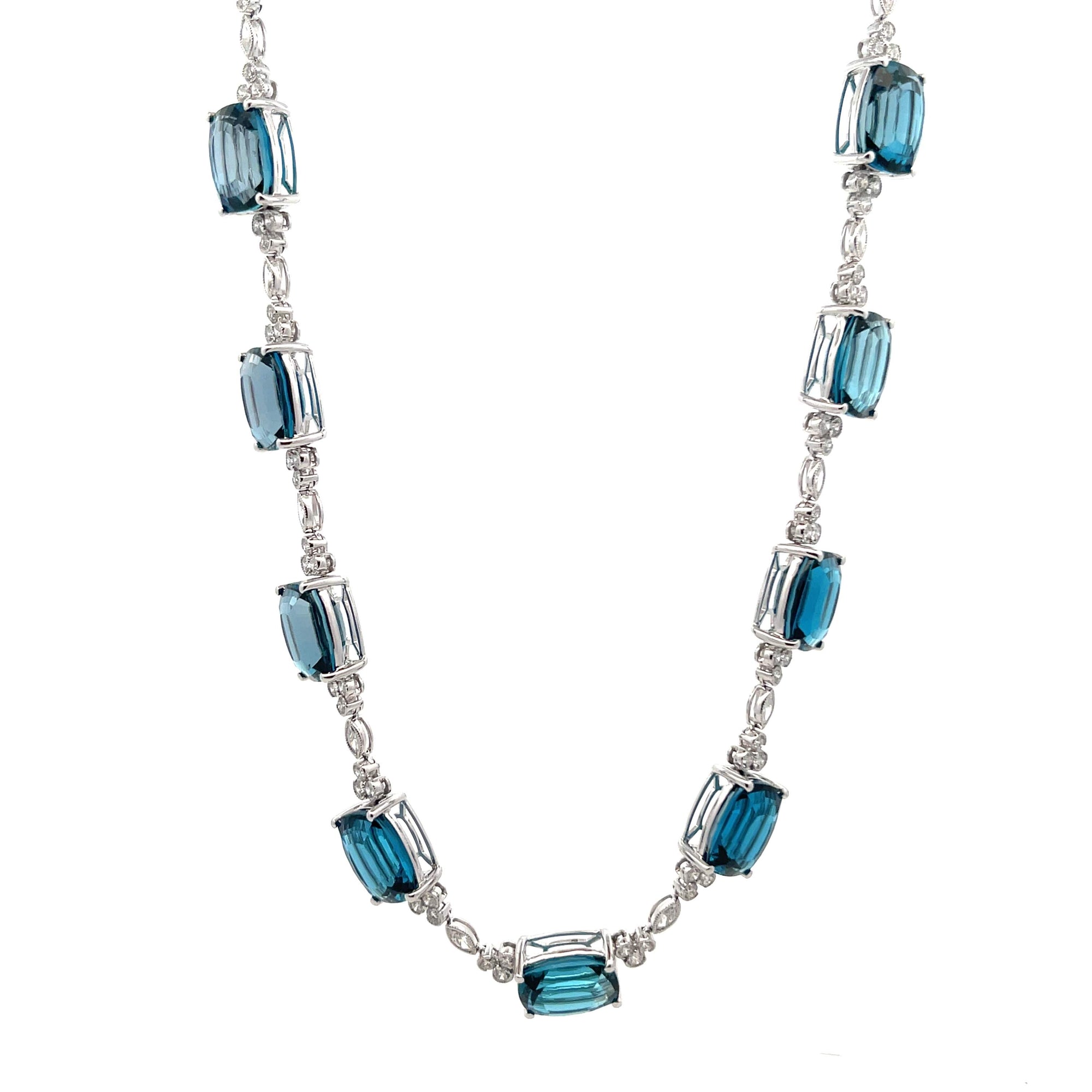 14 karat white gold necklace containing 79.76 carat total of blue topaz surrounded by 3.23 carat total of diamonds.