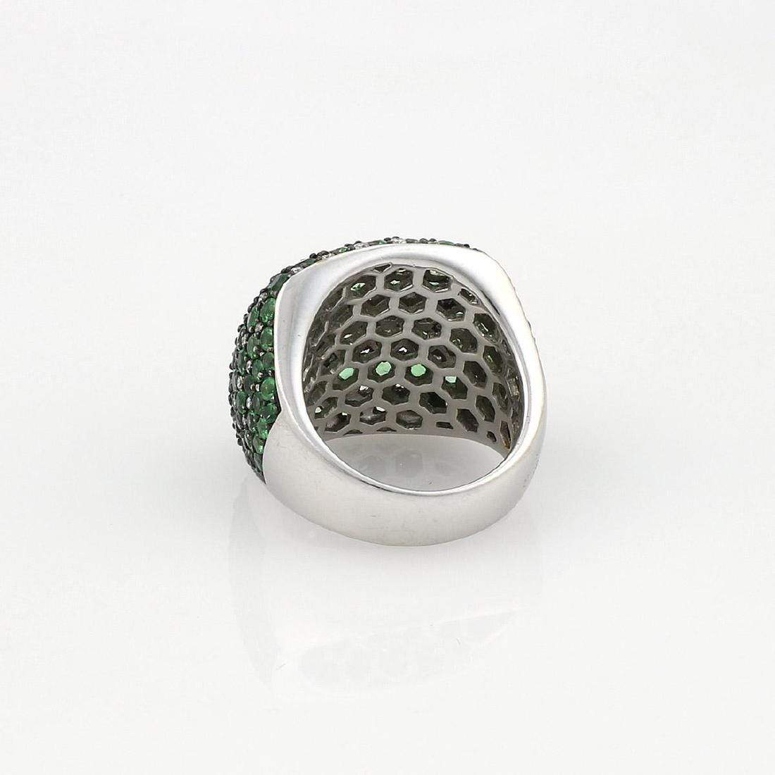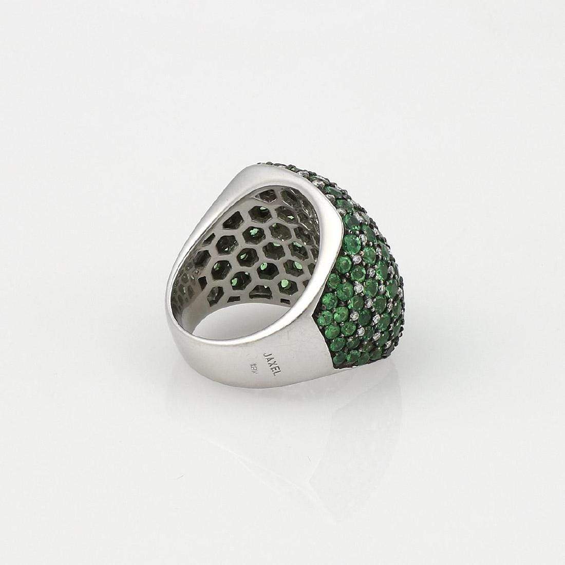 Ring features 7.23 carats total weight of Tsavorites and .84 carats total weight of diamonds, pave set in 18K white gold. Ring is currently a size 7.