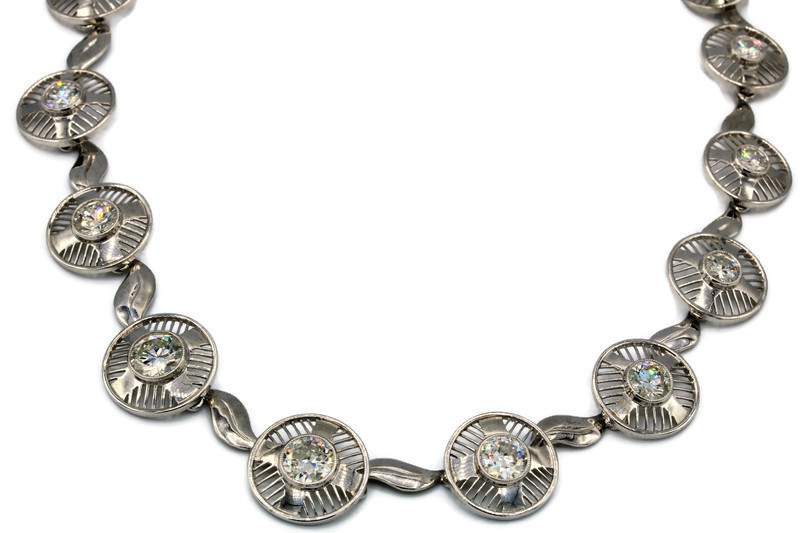 Necklace features 21 Old Euro cut Diamonds, G-H color, VS clarity, set in a unique white gold setting, 16".