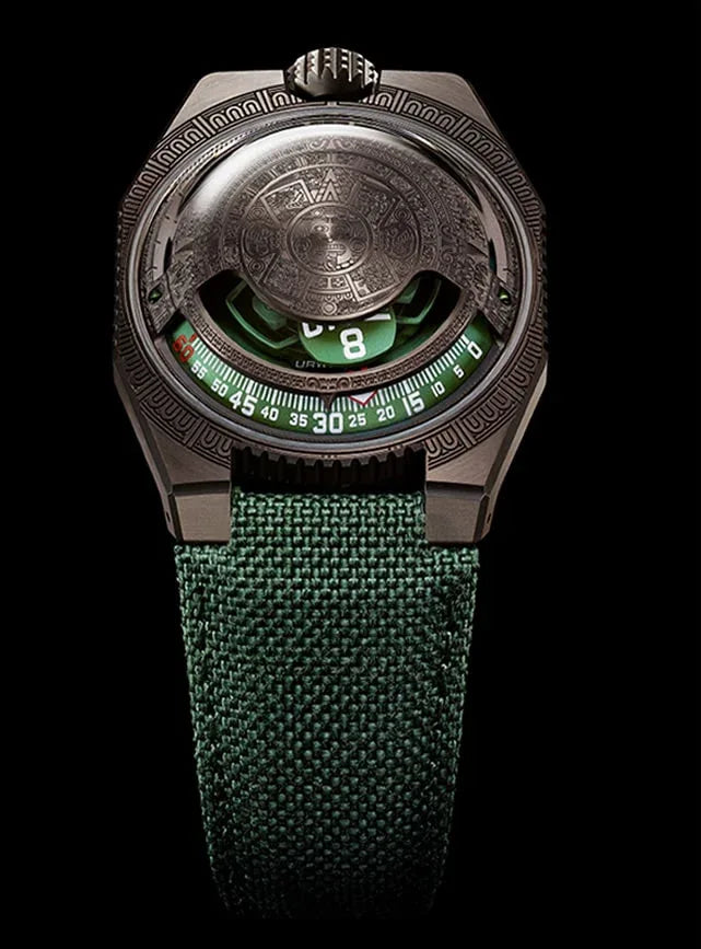 The UR-100V takes us on a journey through both time and space, merging two concepts at the very core of URWERK. The UR-100V SpaceTime features URWERK’s iconic satellite display, differing in one significant way. After minute pointers on the hour satellites disappear, they pass between subsidiary dials to display astronomical indications.