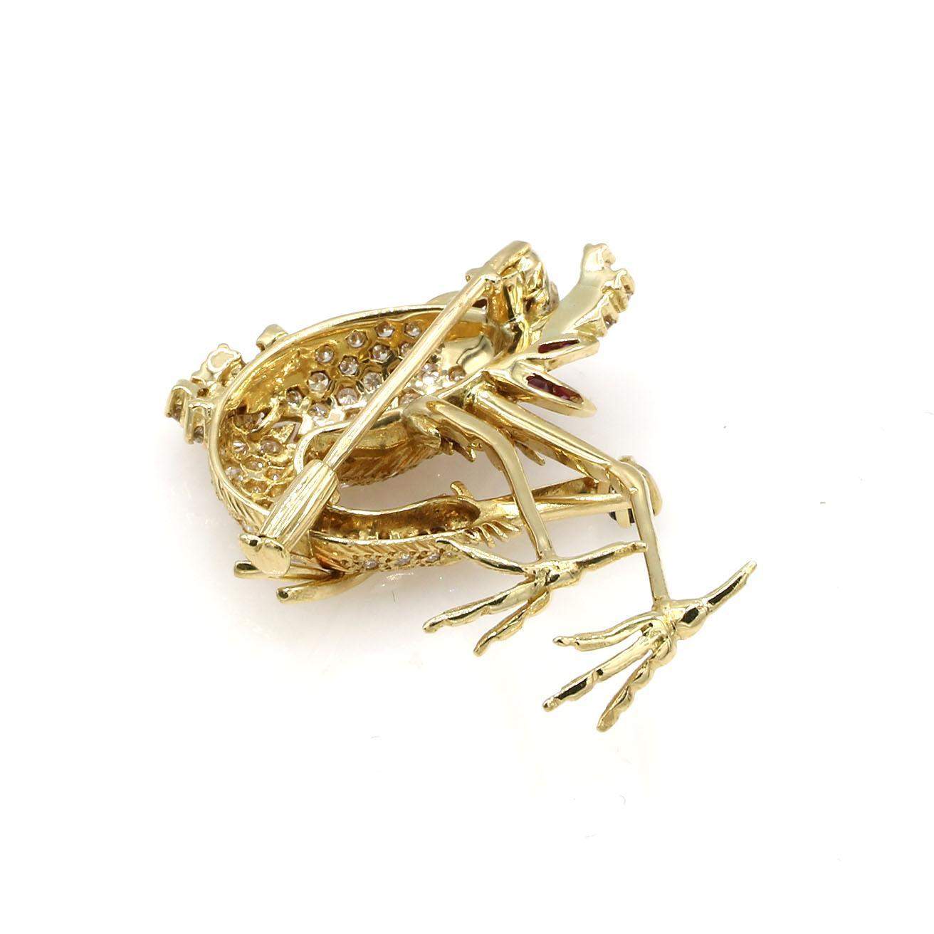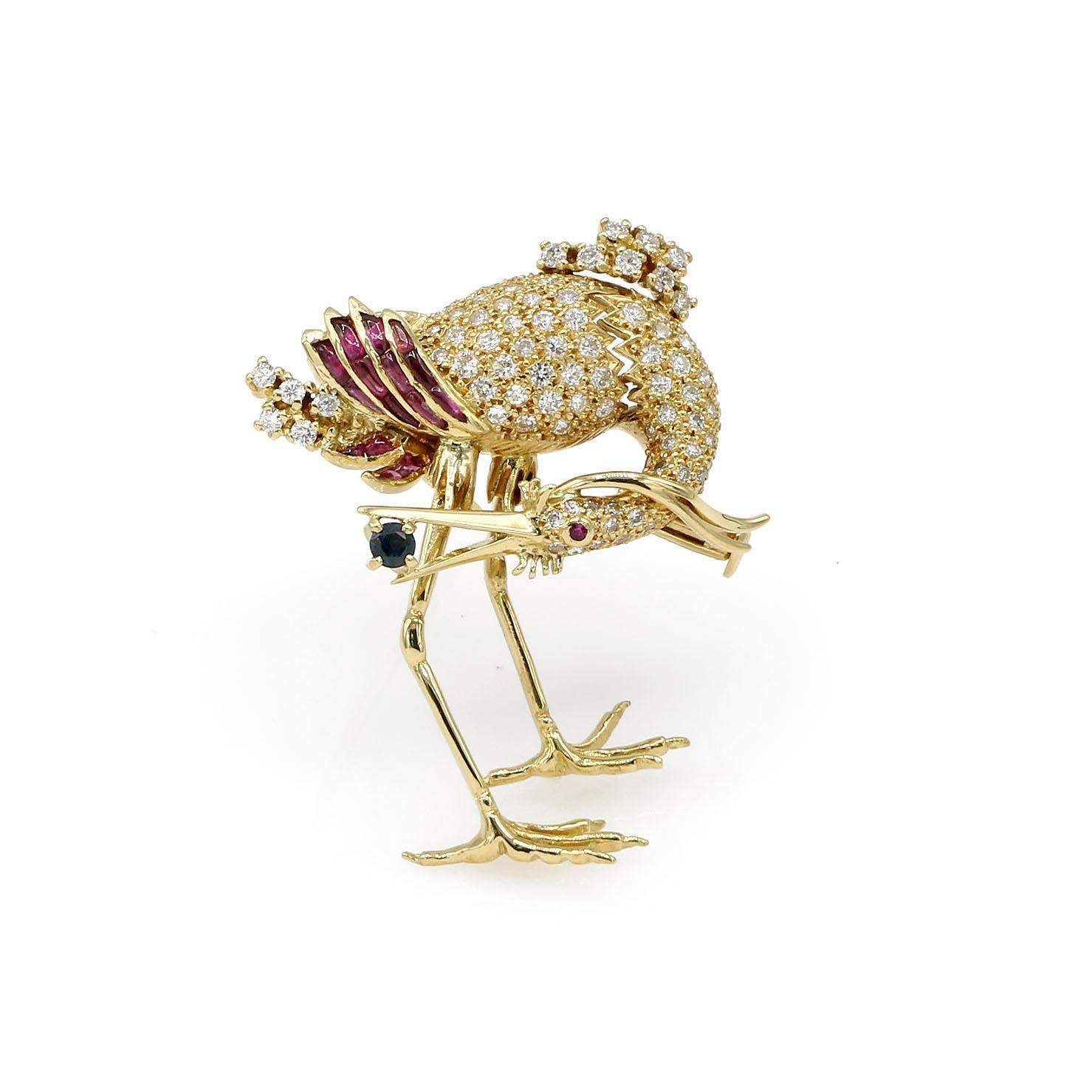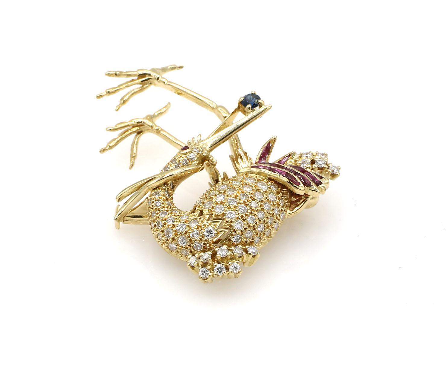 Brooch features diamonds, rubies and a single sapphire held in the bird's beak, set in 18K yellow gold.