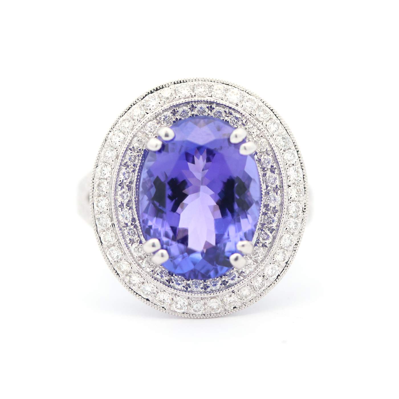 18K White Gold Oval Tanzanite And Diamond Double Halo Ring, Tanzanite= ~6.05Ctw, Diamonds= ~0.79Ctw