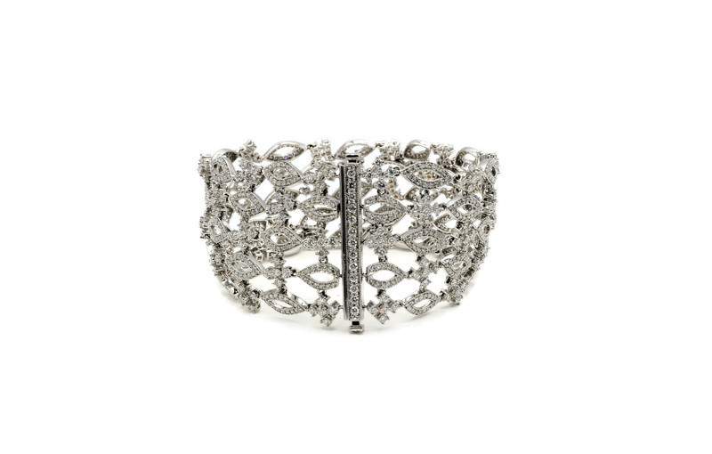 Bracelet features 7.47 carats total weight of diamonds with E-F color and SI clarity, set in an intricate link design of 18K white gold.
